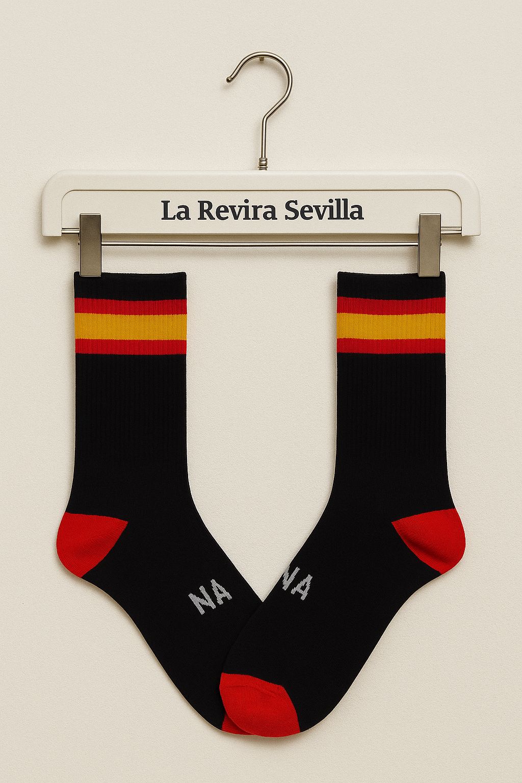calcetines deportivos con la bandera de España.Color negro. Composición: 98% algodón, 2% elastano. Canalé elástico en empeine y caña. Talla ajustable del 41 al 46.